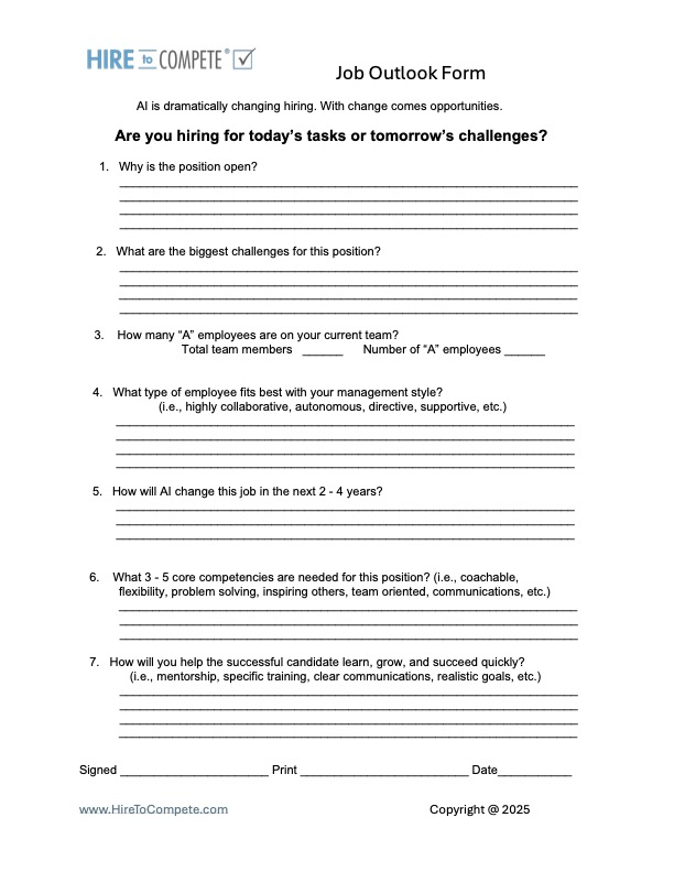 The free Job Outlook form captures the manager’s strategic thoughts on the open position before the candidate search begins.